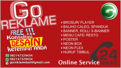 Halo sobat BaliPedia….Sekarang ada jasa pembuatan reklame secara online lho, namanya Go Reklame. Sobat BaliPedia bisa membuat apa saja seputar periklanan, seperti desain logo, neonbox,