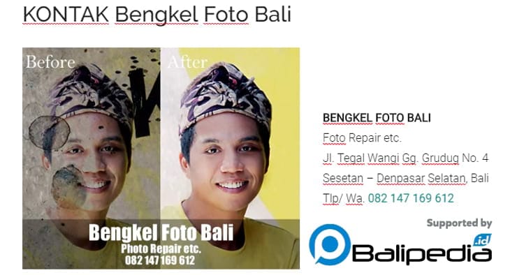 Namanya Bengkel Foto Bali. Alamat dan kontak bisa cek di tulisan paling terakhir ini. Bengkel Foto Bali adalah tempat untuk memperbaiki foto rusak atau foto kadaluarsa (restorasi foto).